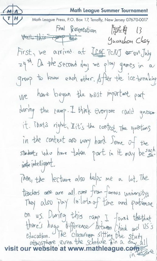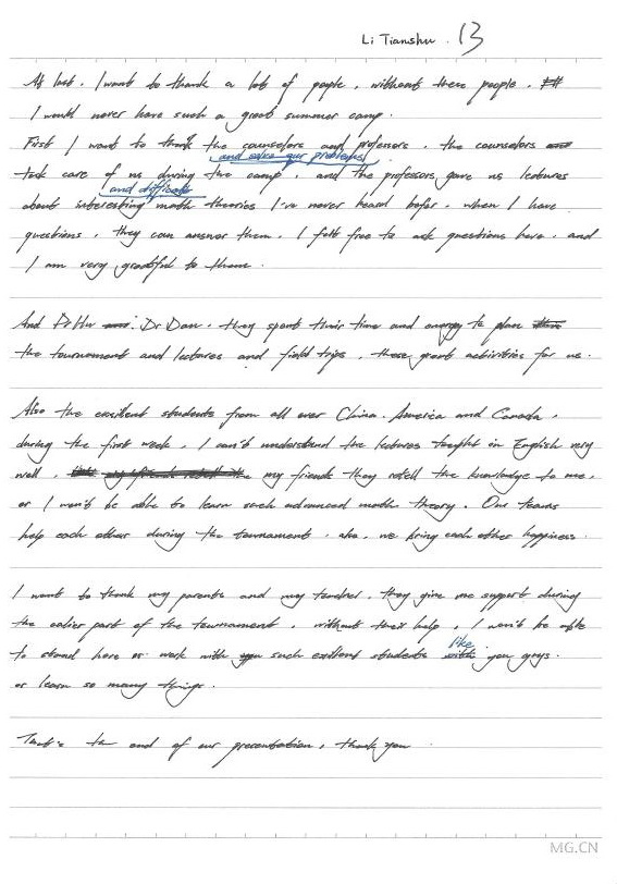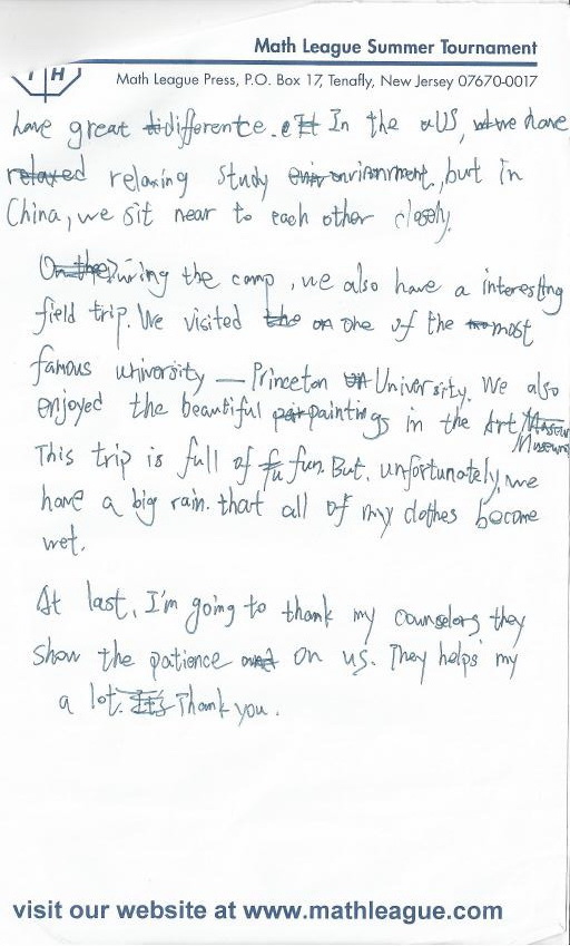 First I want to thank the counselors and professors, the counselors took care of us during the camp, and solve our problems, and the professors gave us lectures about interesting and difficult math theories. I’ve never heard before, when I have questions, they can answer them. I felt free to ask questions have: and I am very grateful to them.