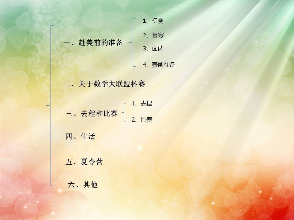 说实话,我是迷迷糊糊地去参加美国数学大联盟杯赛的。当时老师让我们自己报名,我看同学们都去报名了于是我也和他们一起。初赛的比赛地点是在一个培训机构,之前以为初赛的题目肯定很简单,只要看得懂就肯定会做。but是我想多了,当我看着那张试卷的时候,我懵了,差不多每一道题目都出现了数学的专有名词。一张试卷除了全是阿拉伯数字的和一些题目较简短的题看得懂会做以外,其他……但是呢,在我们班里得了奖的同学也有8个。虽说我只得了三等奖(呵呵呵)不过呢我还是进了复赛。