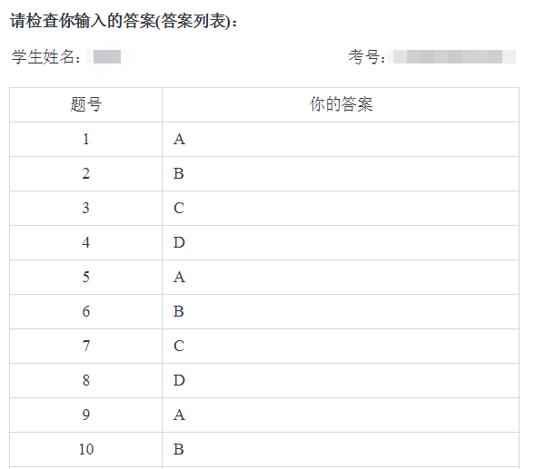 - 学生提交答案前,系统会在电脑屏幕上列出学生的答案列表(类似下图),